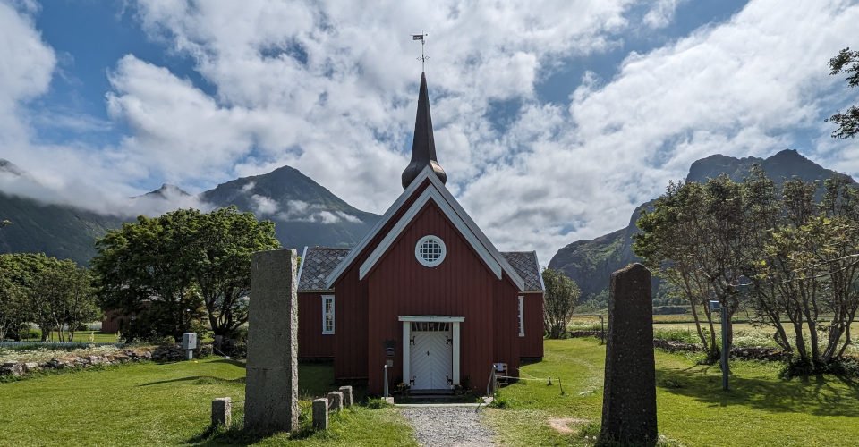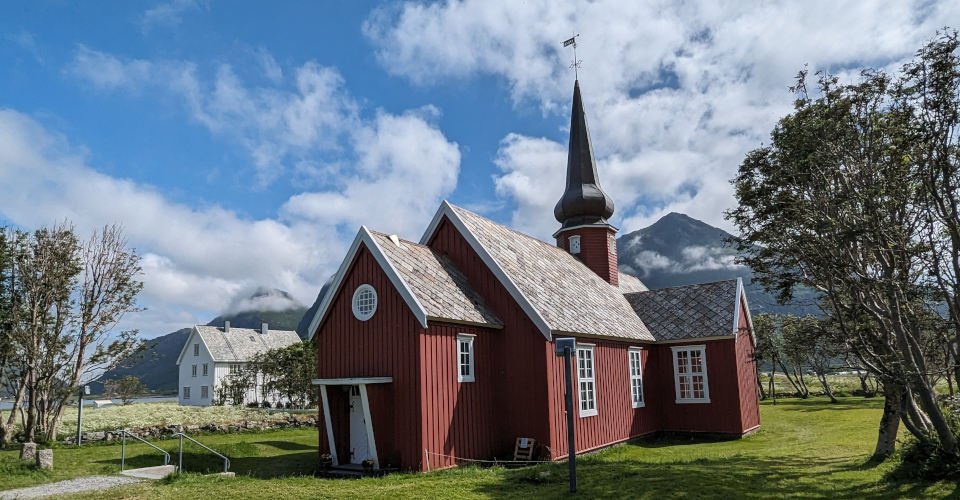 - ca. 30 min Landschaftsfahrt zur kleinen Flakstad-Kirche, ca. 30 min Besichtigung