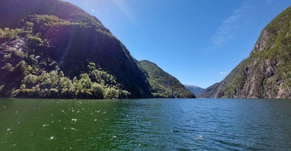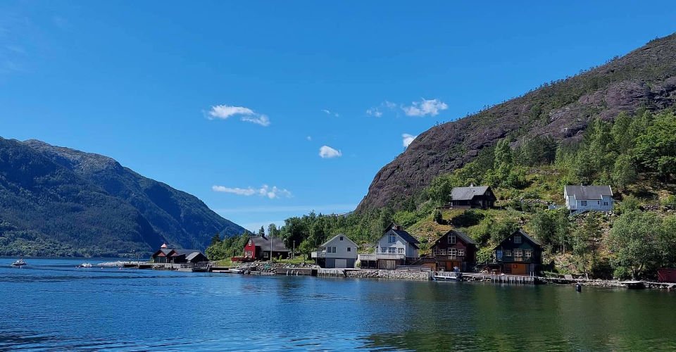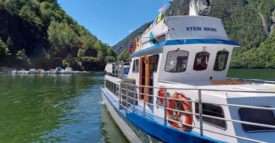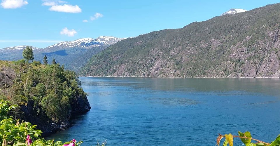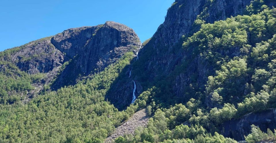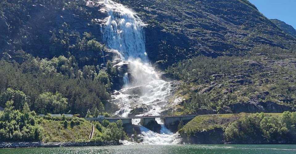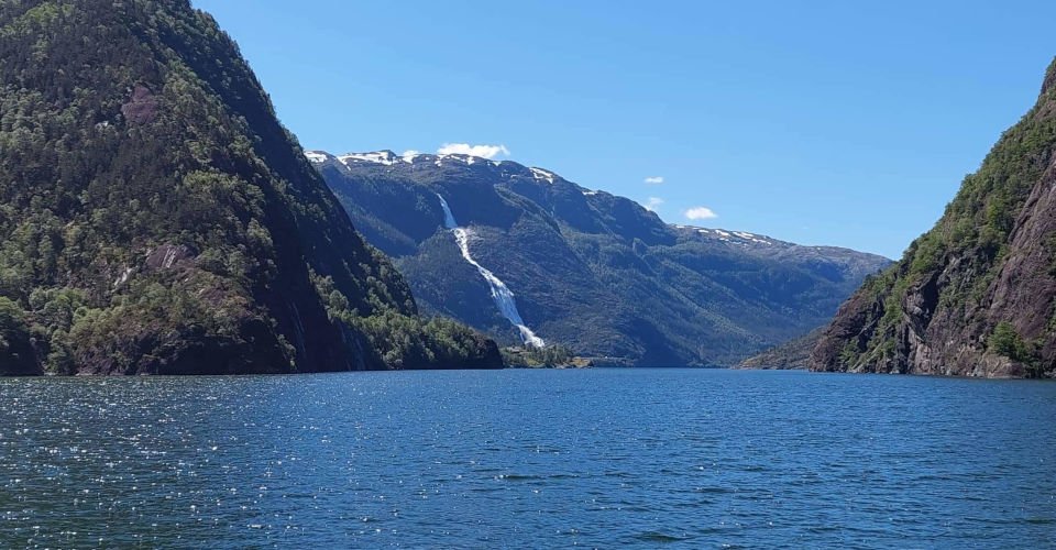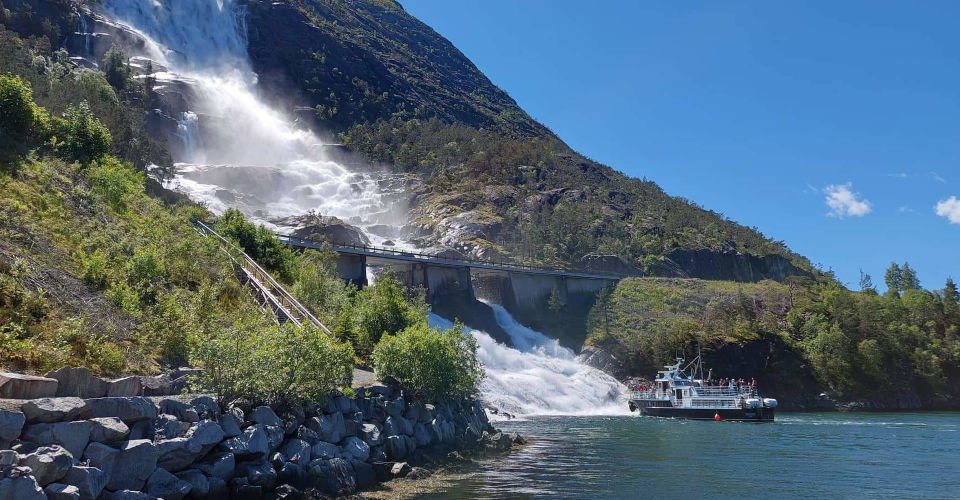 - Umstieg in ein Ausflugsboot und ca. 50 min Fahrt durch den Fjord direkt zum Fuße des 612 m hohen Langfoss-Wasserfalls, dem magische energetisierende Kräfte nachgesagt werden