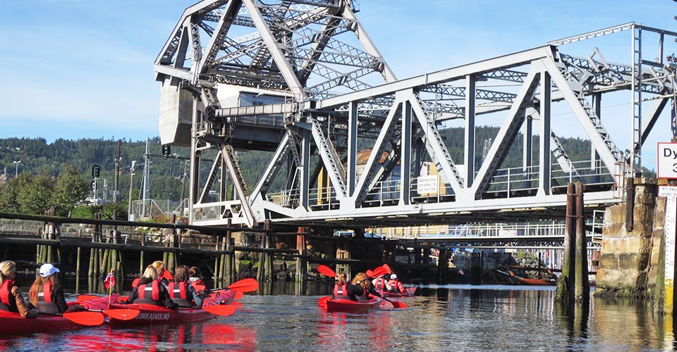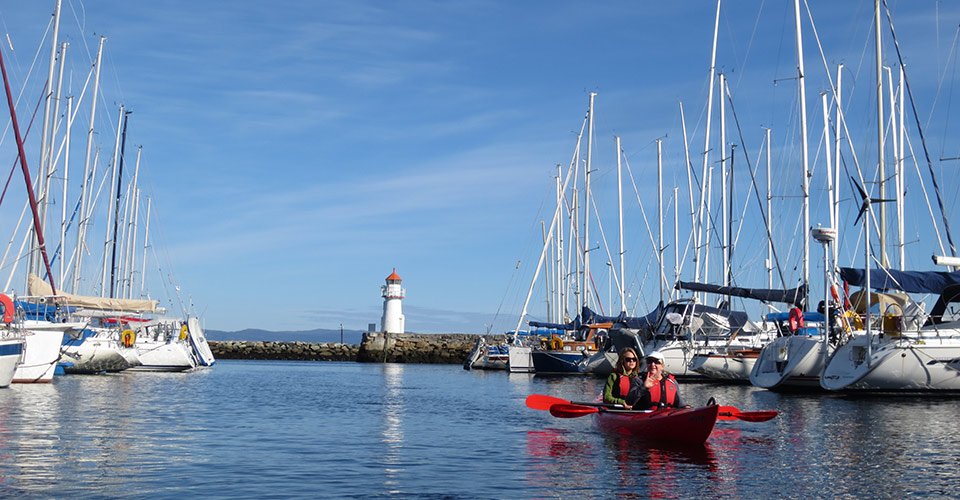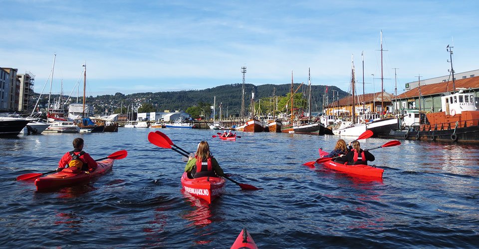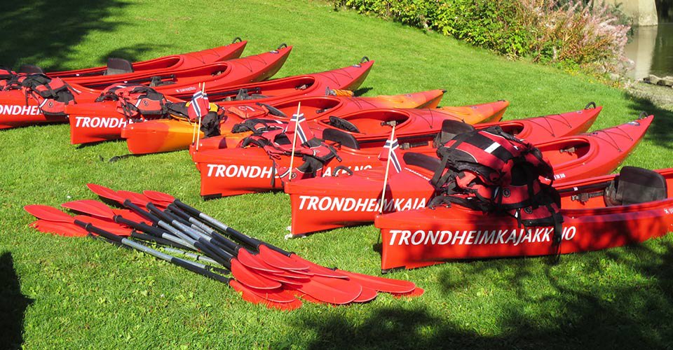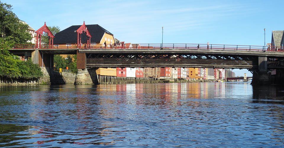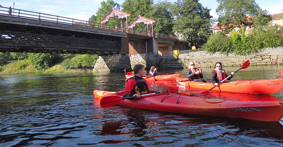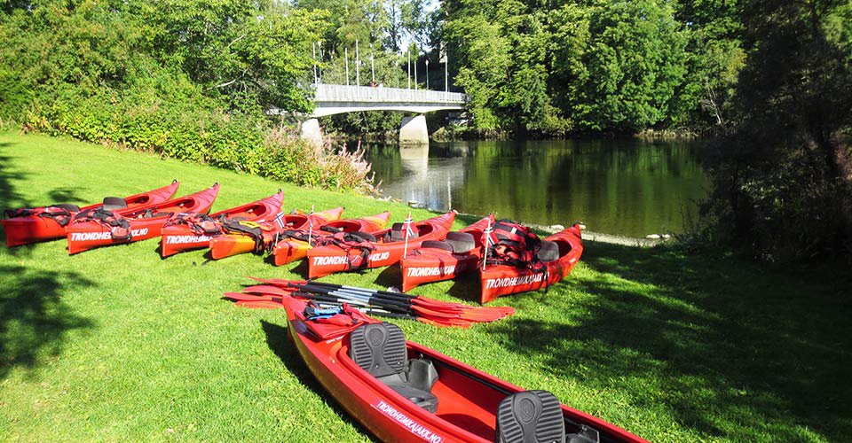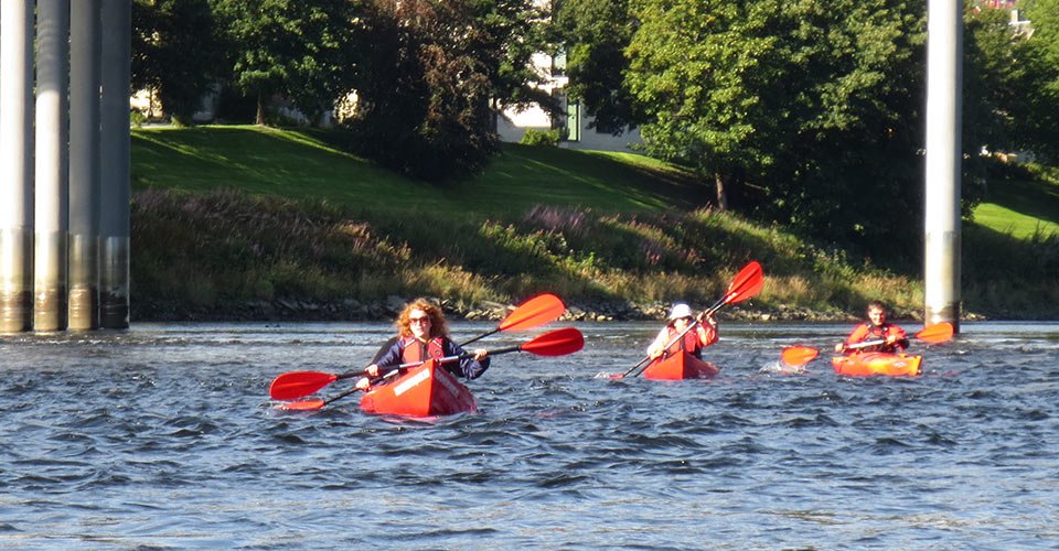 - ca. 2 h Kajaktour (Zweisitzer) auf dem Fluss Nidelva, unter der alten Brücke von Bybro hindurch und vorbei an Bakklandet
