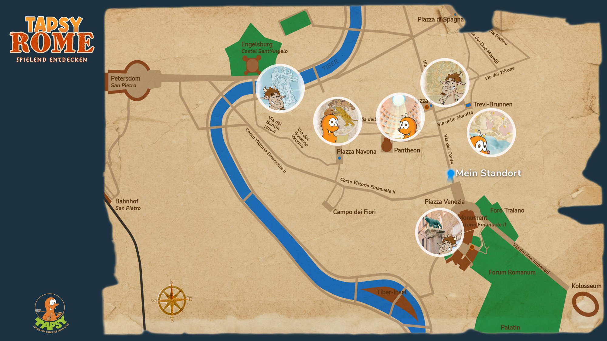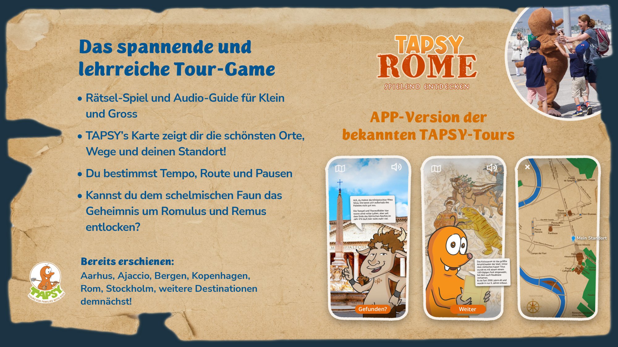 - Entdecken Sie auf der Tapsy Tour die Highlights von Rom und helfen Sie Rea Silvia, ihre Zwillinge Romulus und Remus zu finden, deren Verschwinden das Schicksal Roms gefährdet.